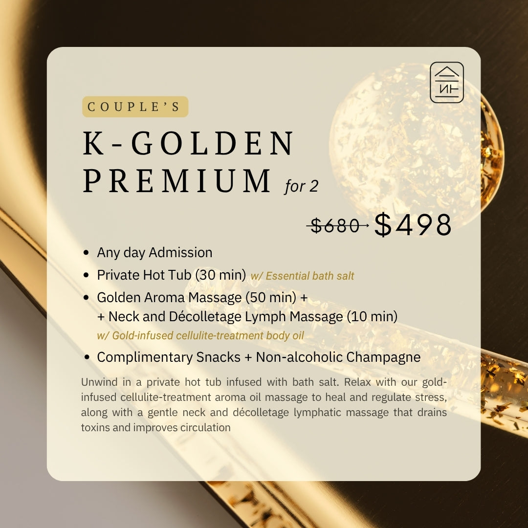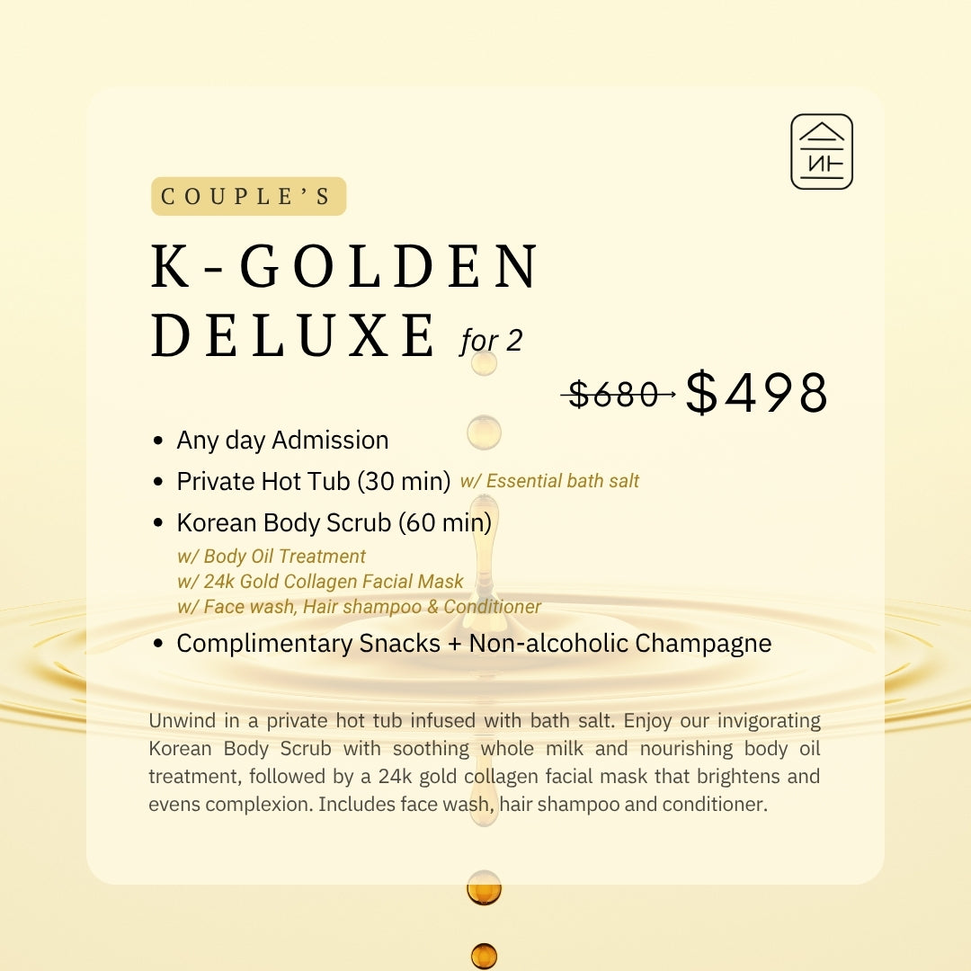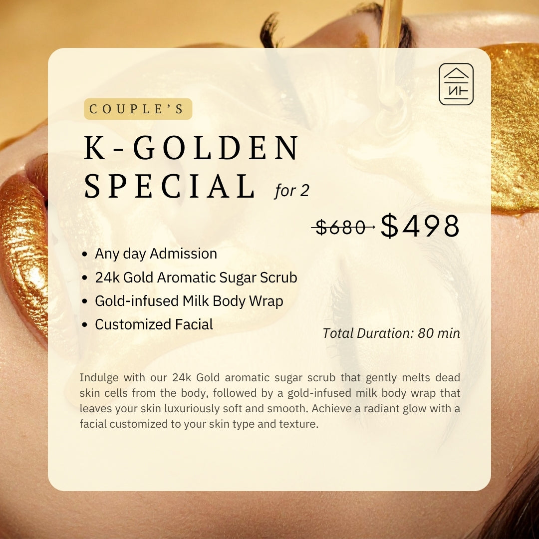 Unwind in a private hot tub infused with bath salt. Enjoy our invigorating Korean Body Scrub with soothing whole milk and nourishing body oil treatment, followed by a 24k gold collagen facial mask that brightens and evens complexion. Includes face wash, hair shampoo and conditioner.